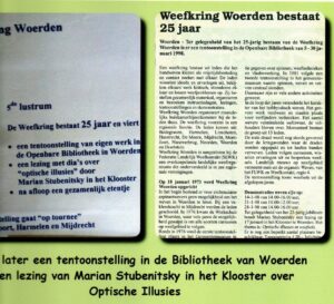 Er werden verfworkshops en lezingen gehouden, er werden verschillende tentoonstellingen georganiseerd in bibliotheken: Woerden, Harmelen, Montfoort, Aarlanderveen en ter Aar, maar ook in het Provinciehuis van Zuid-Holland (Den Haag) en van Utrecht, het Wevershuisje in Leiden en het Zuwe Ziekenhuis in Woerden.